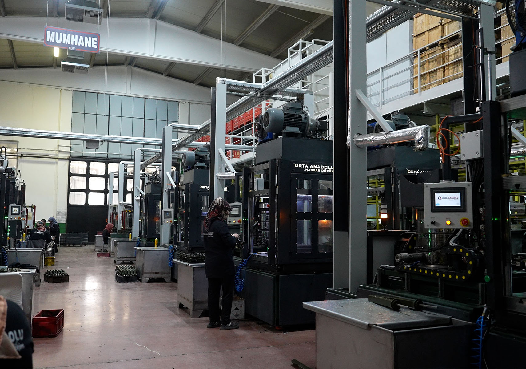 Kalıptan çıkan malzemeler, proses kontroller sağlandıktan sonra salkımlara dizilmek üzere masalara gönderilir.