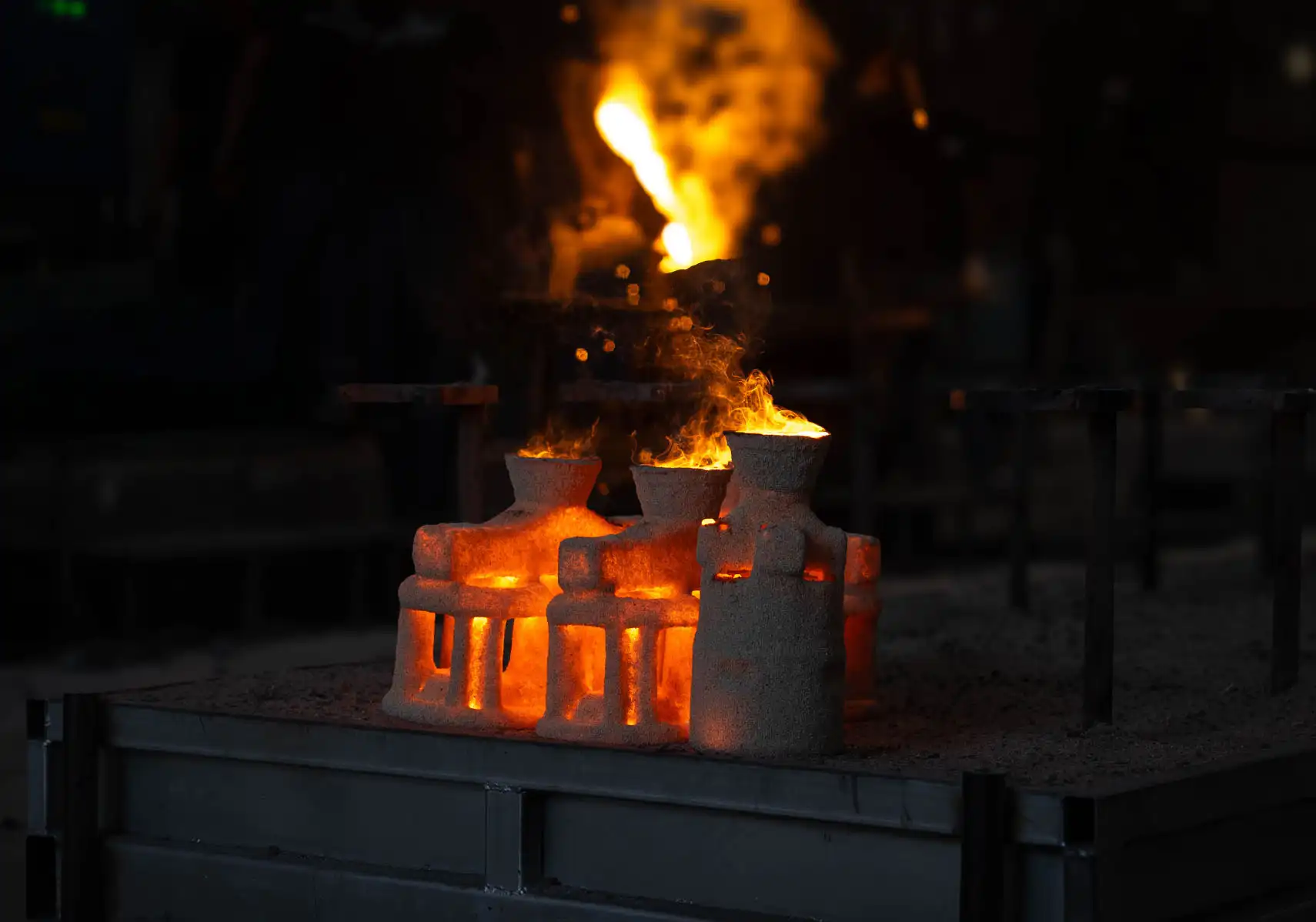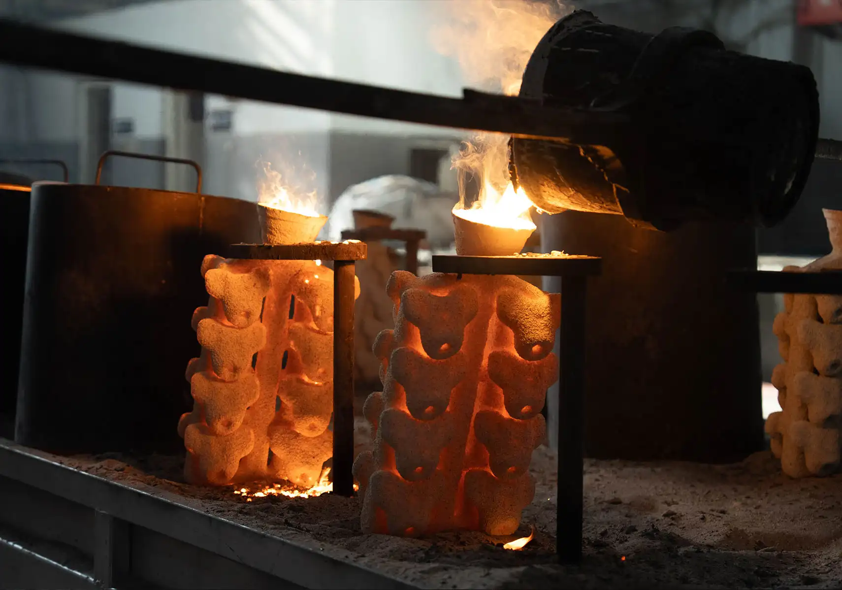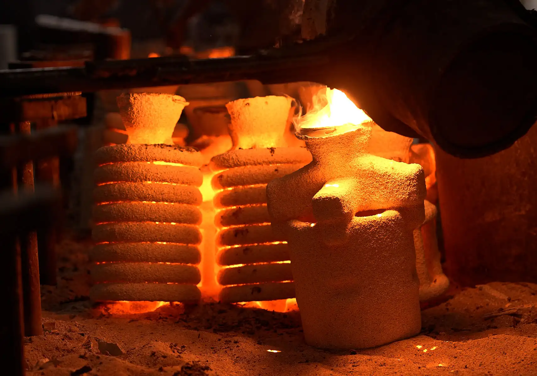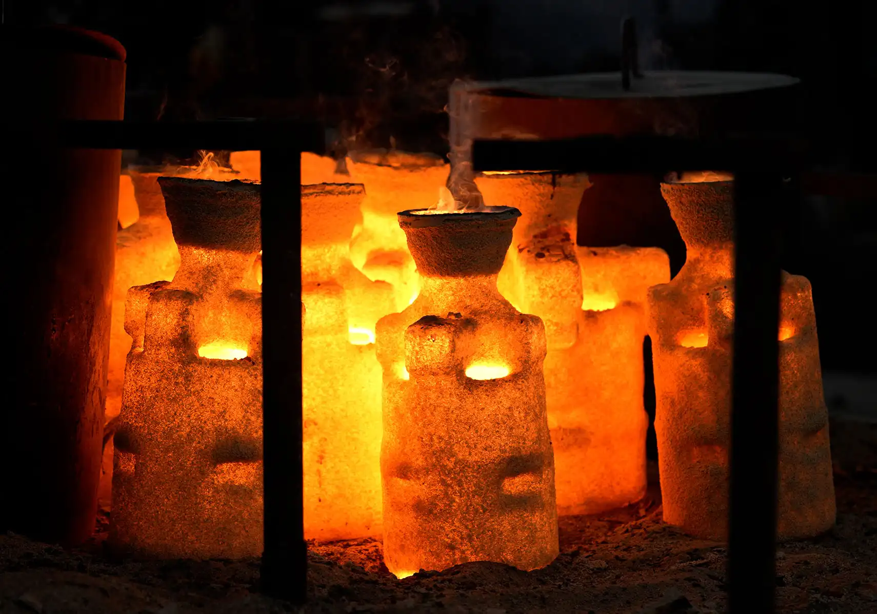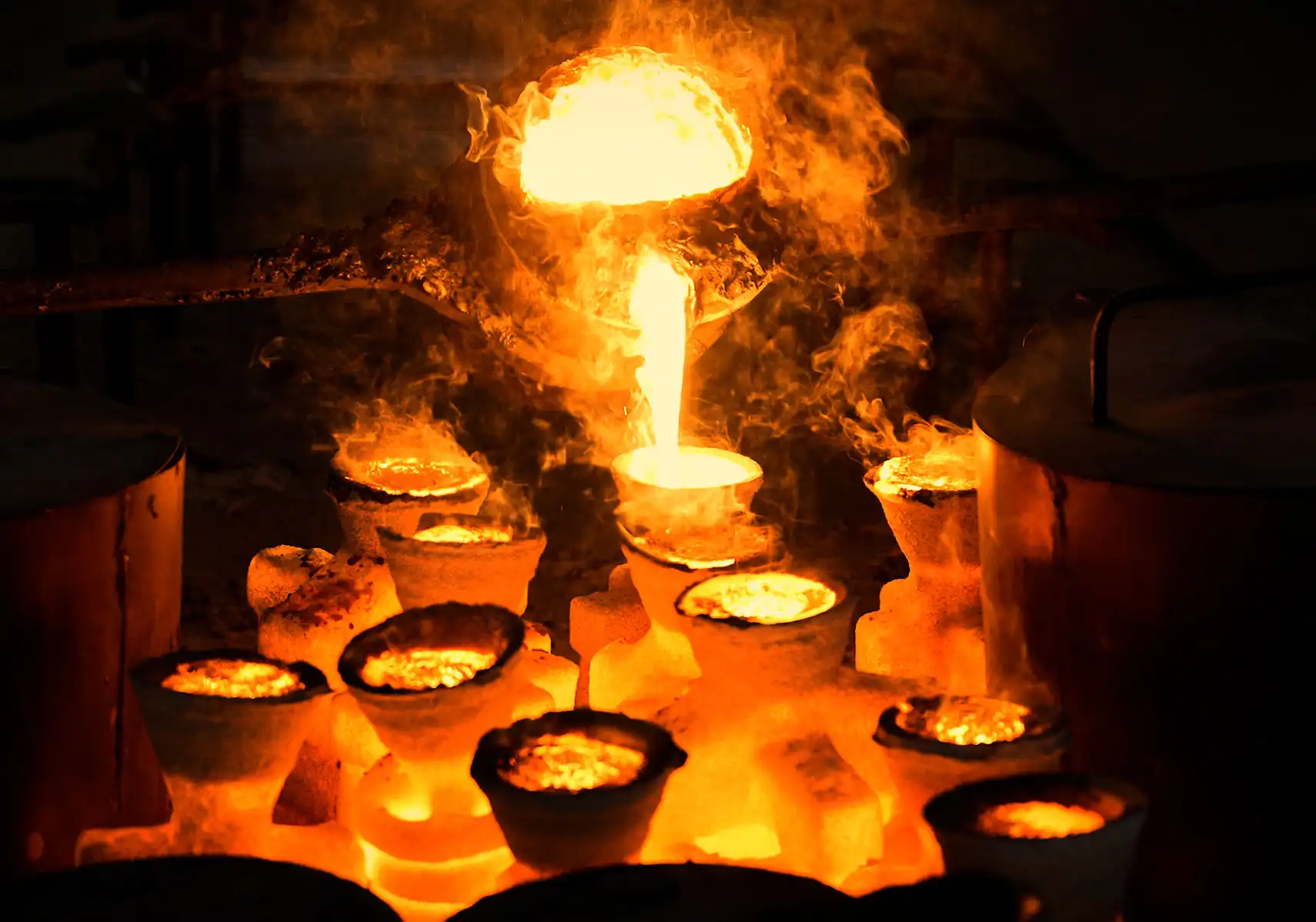Eritilen metal, döküm reçetesinde belirtilen derece sıcaklıkta olan, önceden ısıtılmış seramik kalıplara dökülür.