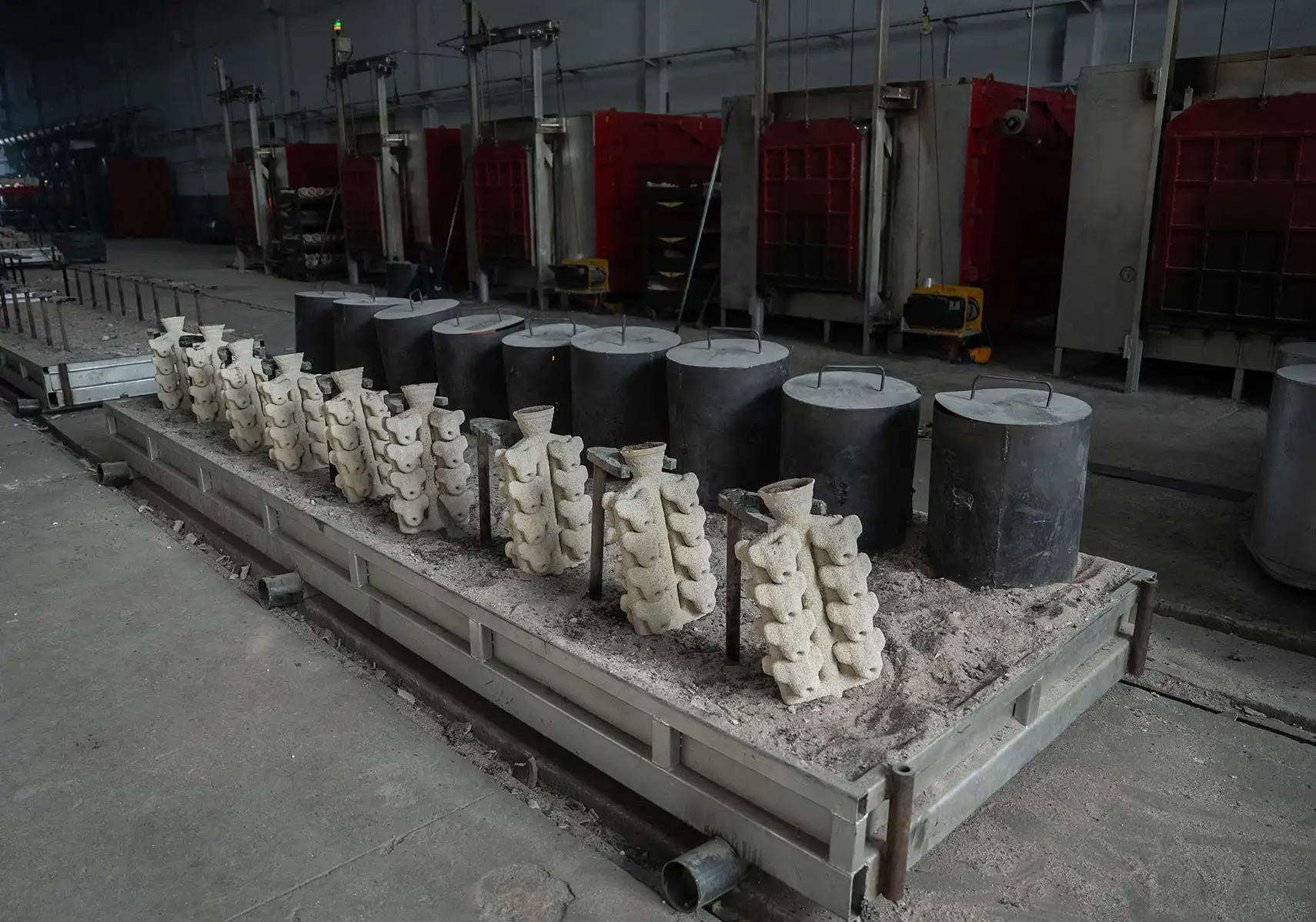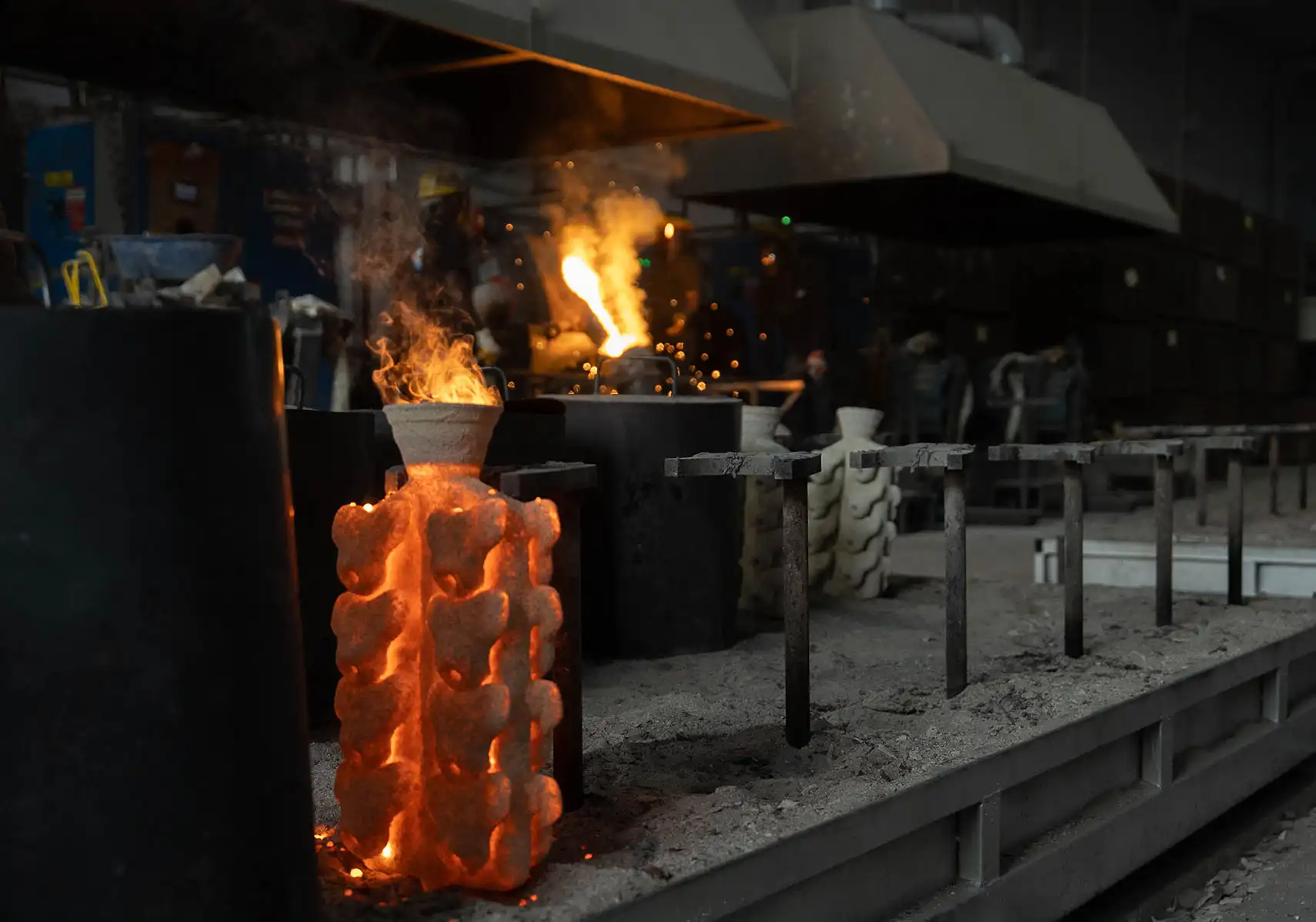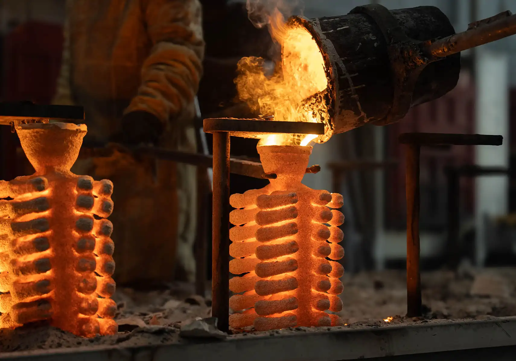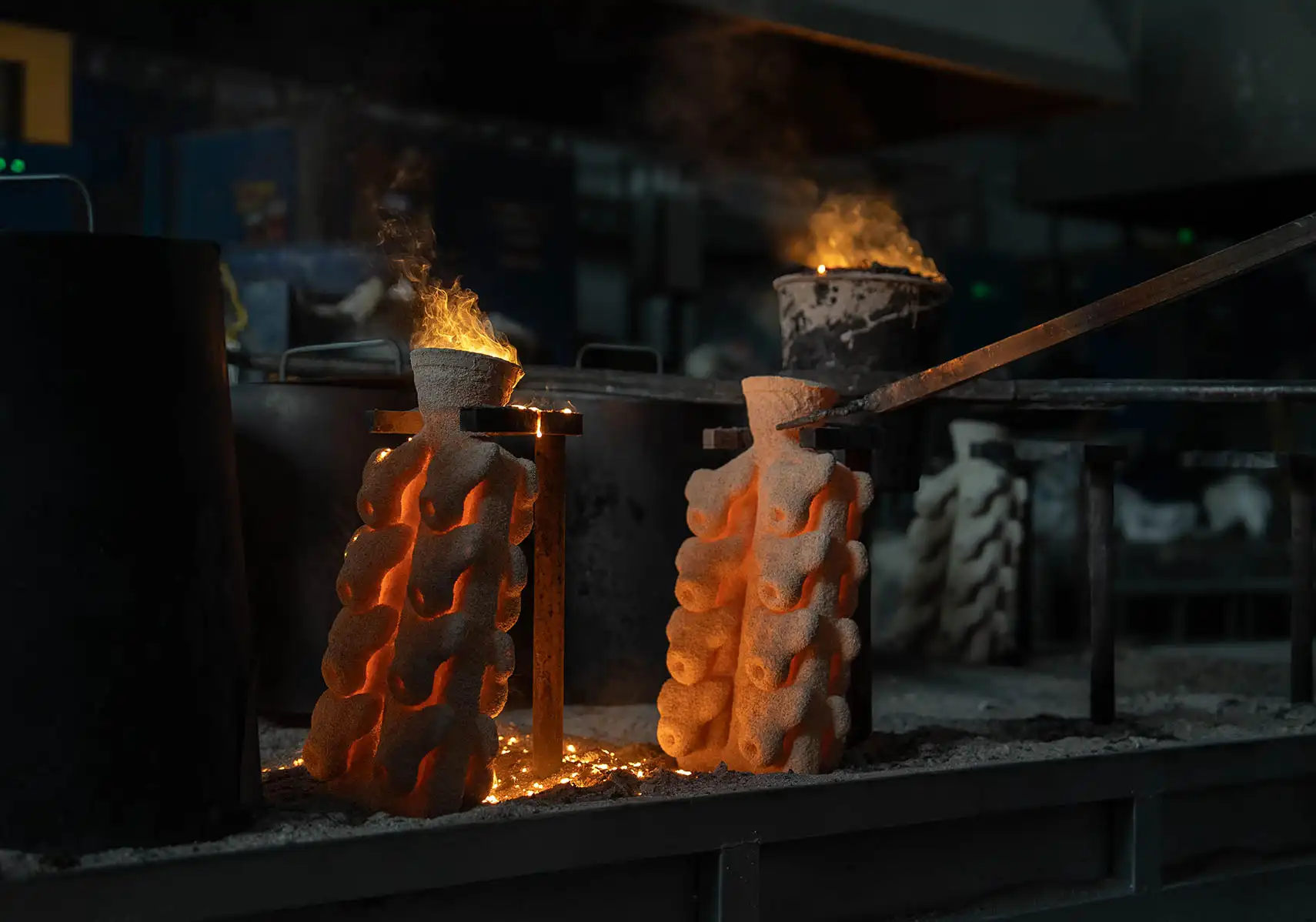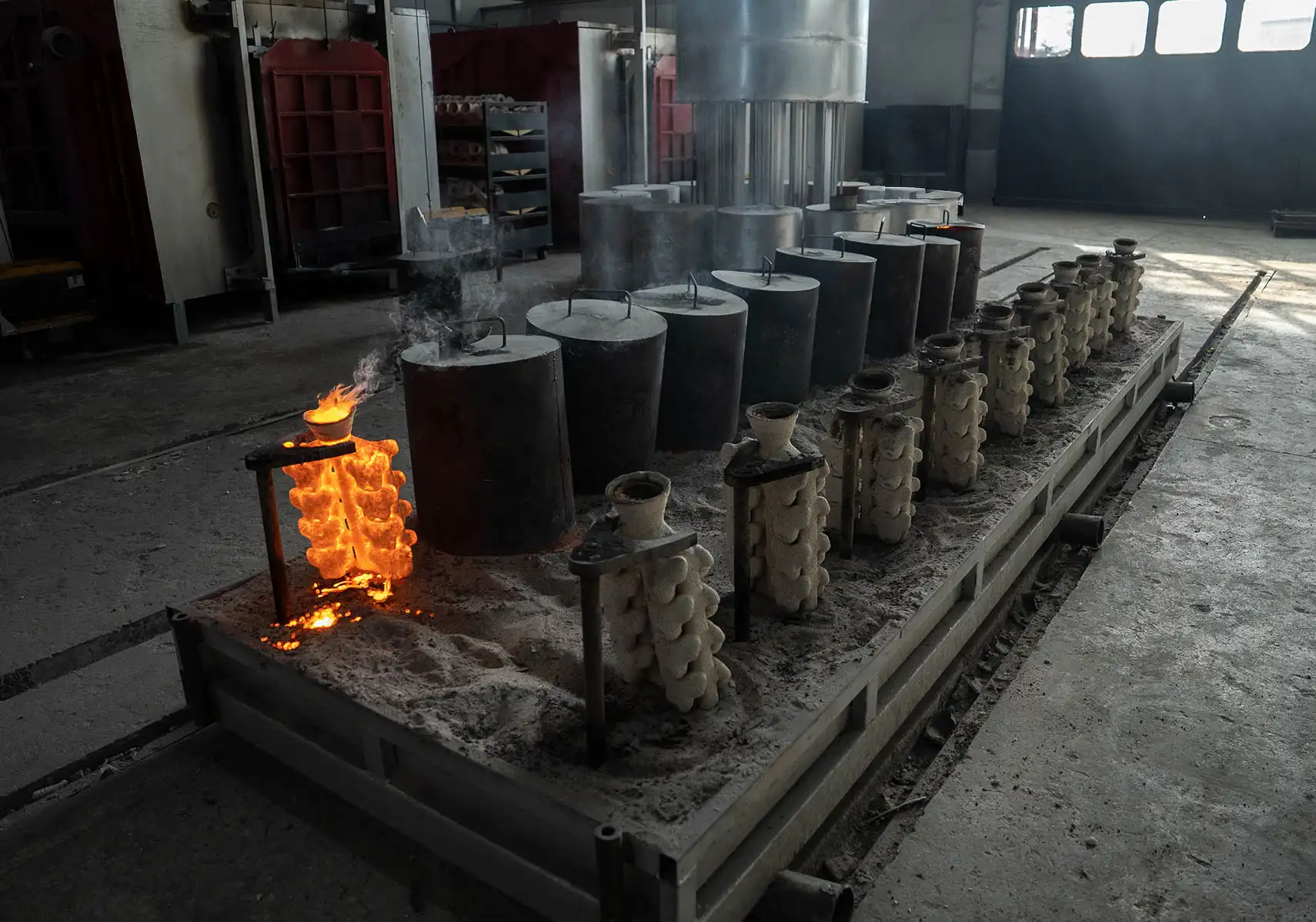 Eritilen metal, döküm reçetesinde belirtilen derece sıcaklıkta olan, önceden ısıtılmış seramik kalıplara dökülür.